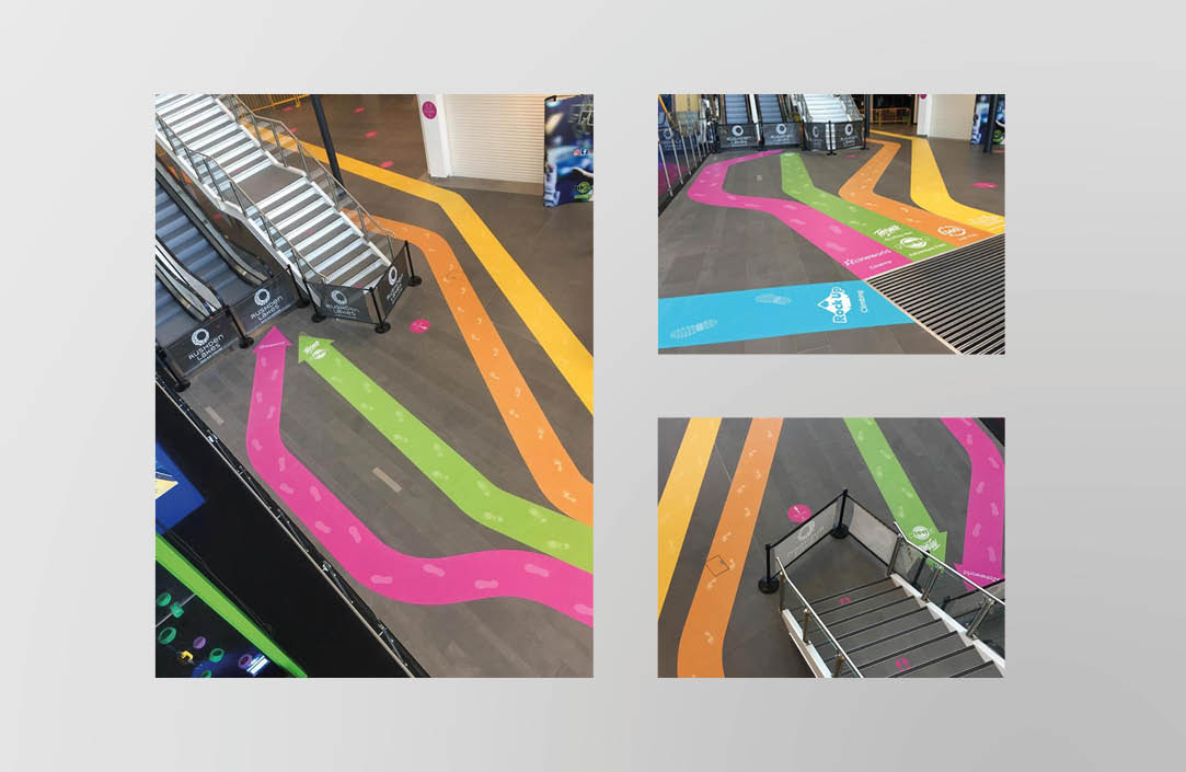 In addition, I developed a series of playful and functional floor wayfinding graphics to guide visitors through the shopping centre. These designs combined bright colours, bold graphics, and clear directional cues to help customers navigate easily, enhancing their experience while reinforcing Rushden Lakes’ contemporary and fun aesthetic.